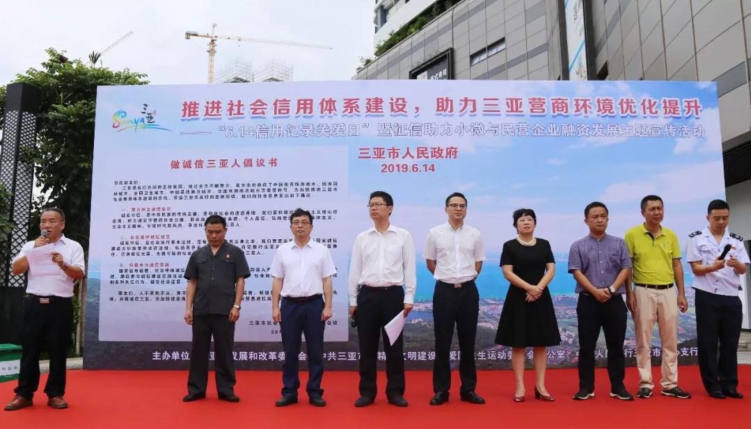 “让我们心怀诚信,积极投身诚信建设,争做诚信先锋,共筑诚信三亚,为加快建设海南自由贸易试验区和自由贸易港扛起三亚新担当……”,6月14日上午,三亚市在蓝海购物广场开展“推进社会信用体系建设,助力三亚营商环境优化提升”——“6.14信用记录关爱日”暨征信助力小微与民营企业融资发展主题宣传活动。