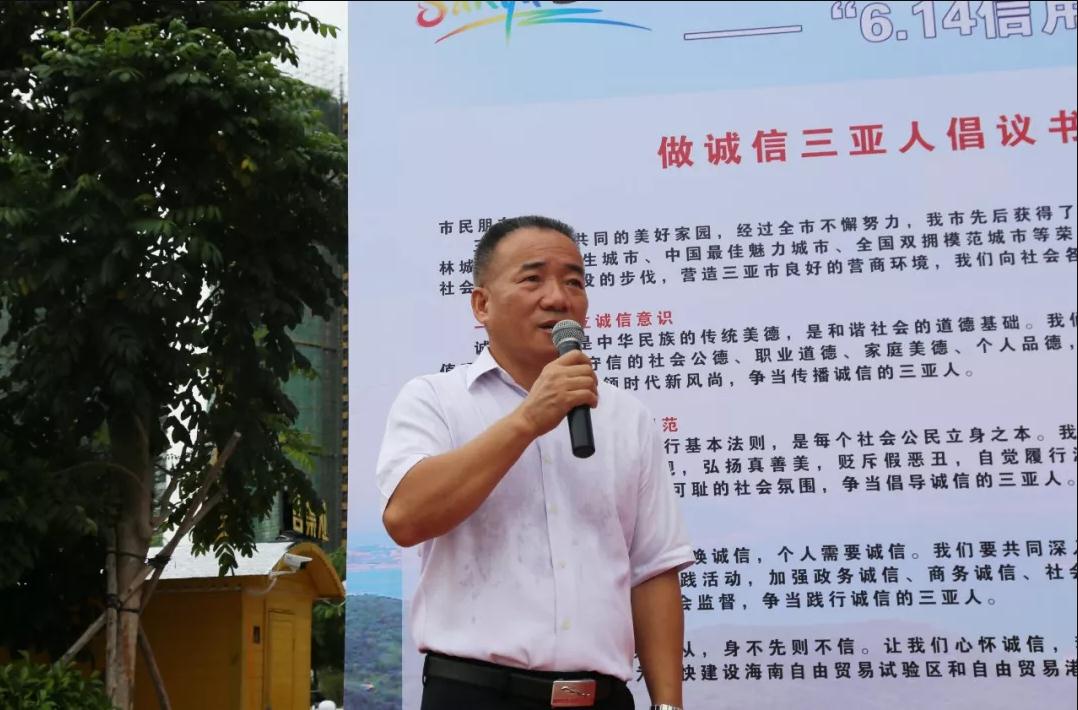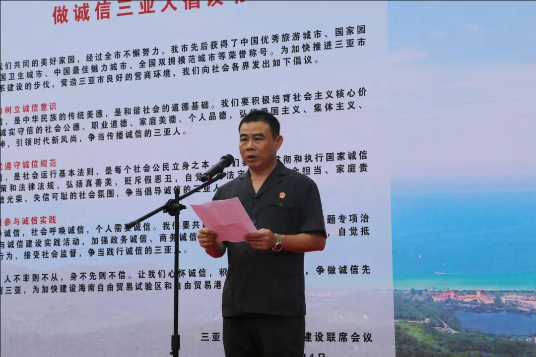 海南省第五届省级诚实守信类道德模范、三亚市益龙海景渔村餐饮店总经理黄兆云现场宣读“做诚信三亚人倡议书”
